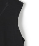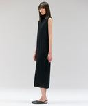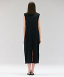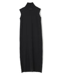 上品に着こなせるスリーブレスニットドレス。ボディラインをほっそりと見せるきれいな縦長シルエット。共糸で施した肩パットが身体になじみながらも女性らしい強さを表現。華奢なタートルとマキシ丈のバランスが気品を漂わせる。