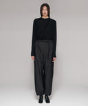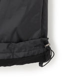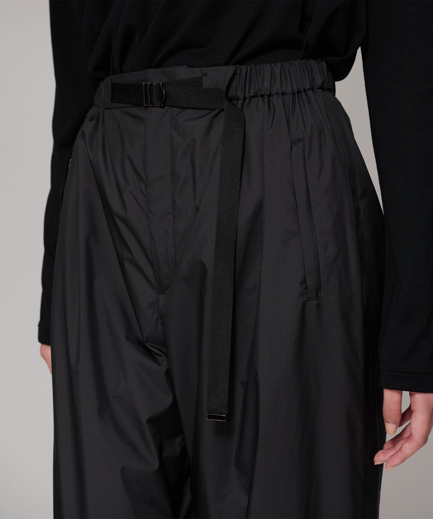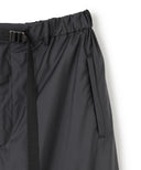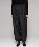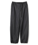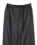 ウエストはアウトドアウエアのディティールを再構築し、上品なタフタ素材を使用する事で、ベルトレスでありながら洗練されたパンツに仕上げている。ふくらみを持たせるために内側にチュールを内蔵し、空気をはらむような優しいニュアンスをプラス。程よい分量感のストレートシルエットのパンツ。裾口の内側に配したゴムにて絞り、パラシュートパンツのシルエットにして着こなしても素敵。