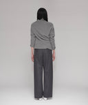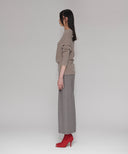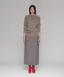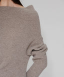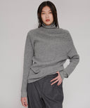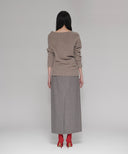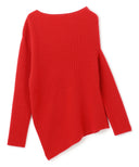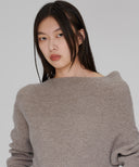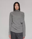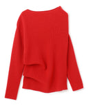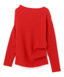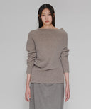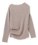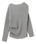 袖の位置をアシンメトリーに施すことで、着用した際に自然と生まれるドレープが奥行きのあるシルエットへと変化する一枚。着方によって着用の幅を広げ、糸の質感と合わさり女性らしい雰囲気を感じさせてくれる。