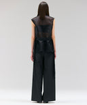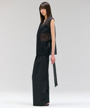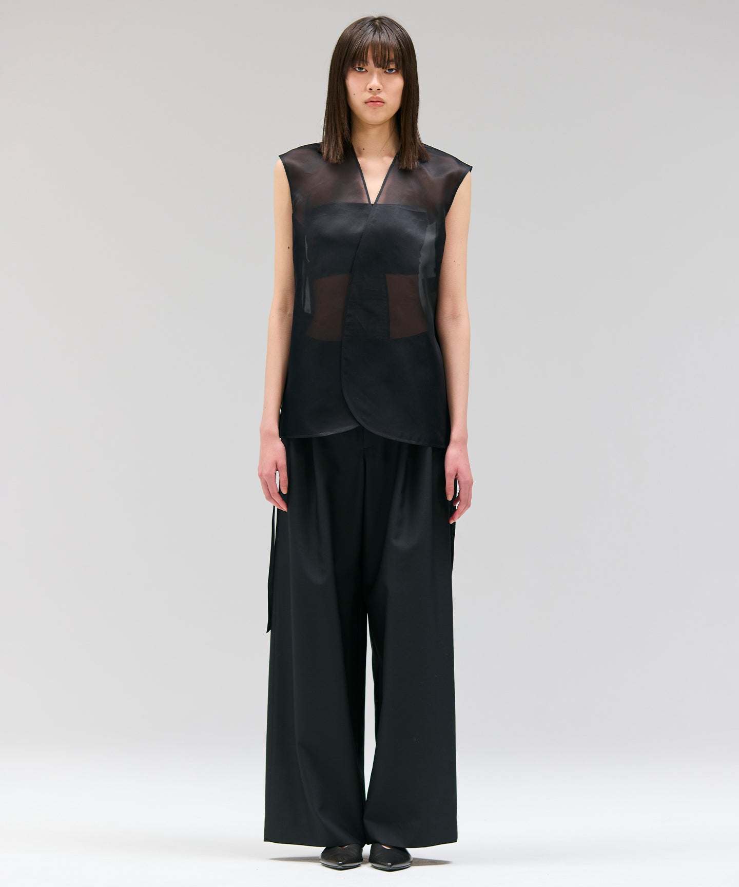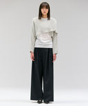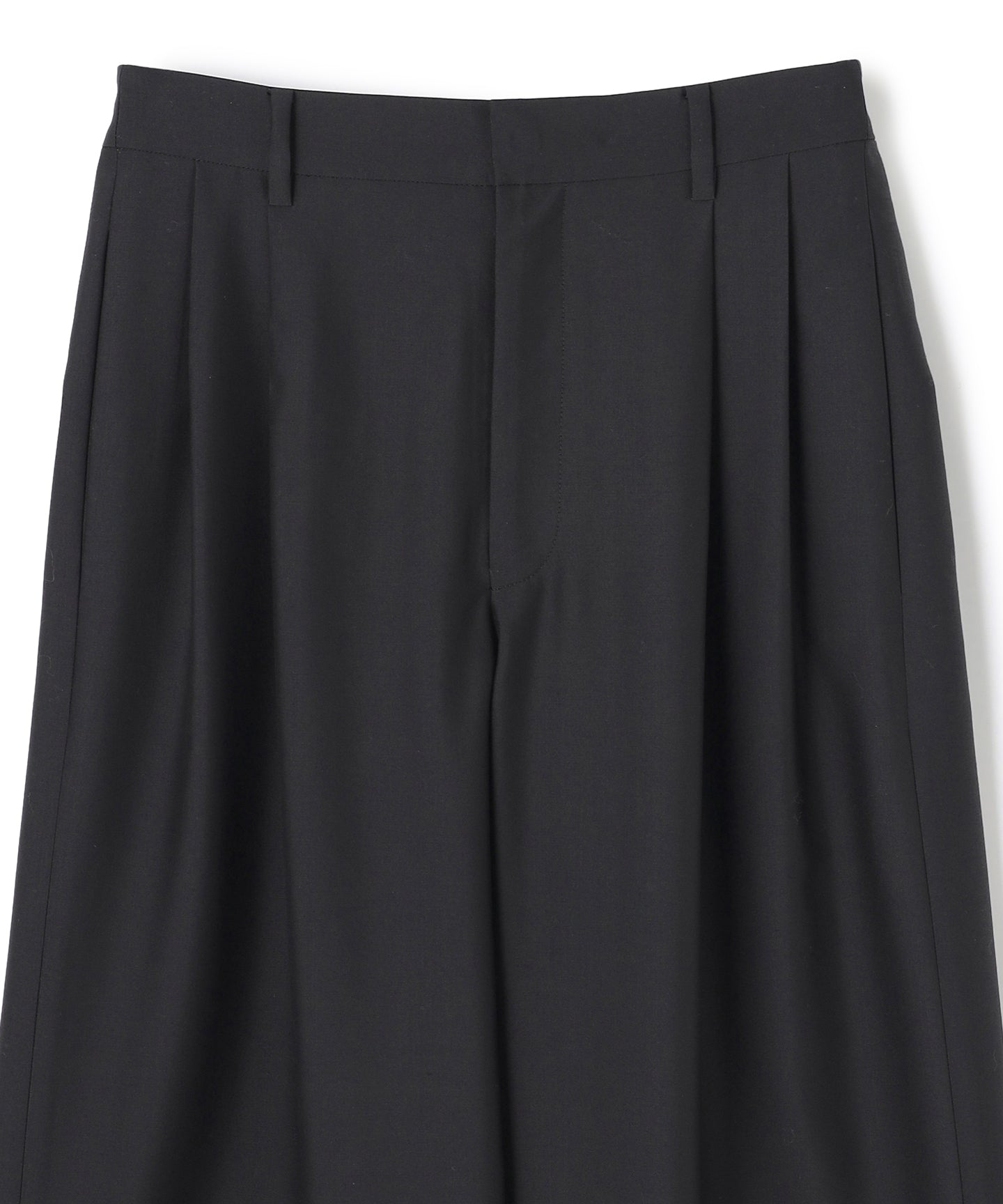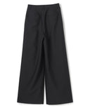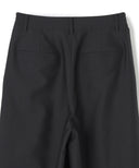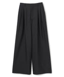 すっきりとしたワイドストレートのタックパンツ。ウエストを落として腰で履く設定。上質なシルクウール素材で、マニッシュ且つエレガントな印象に。
