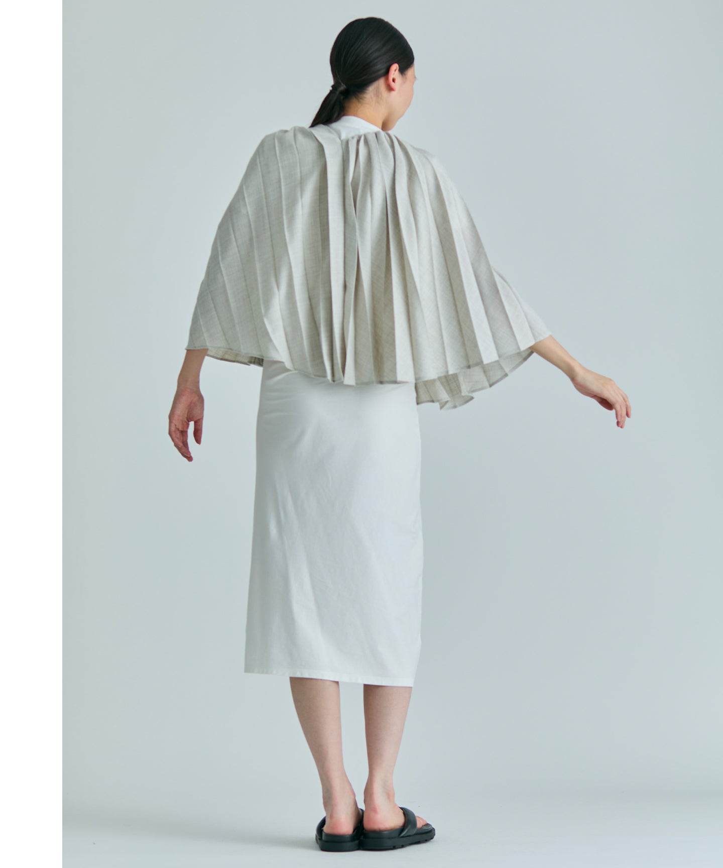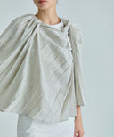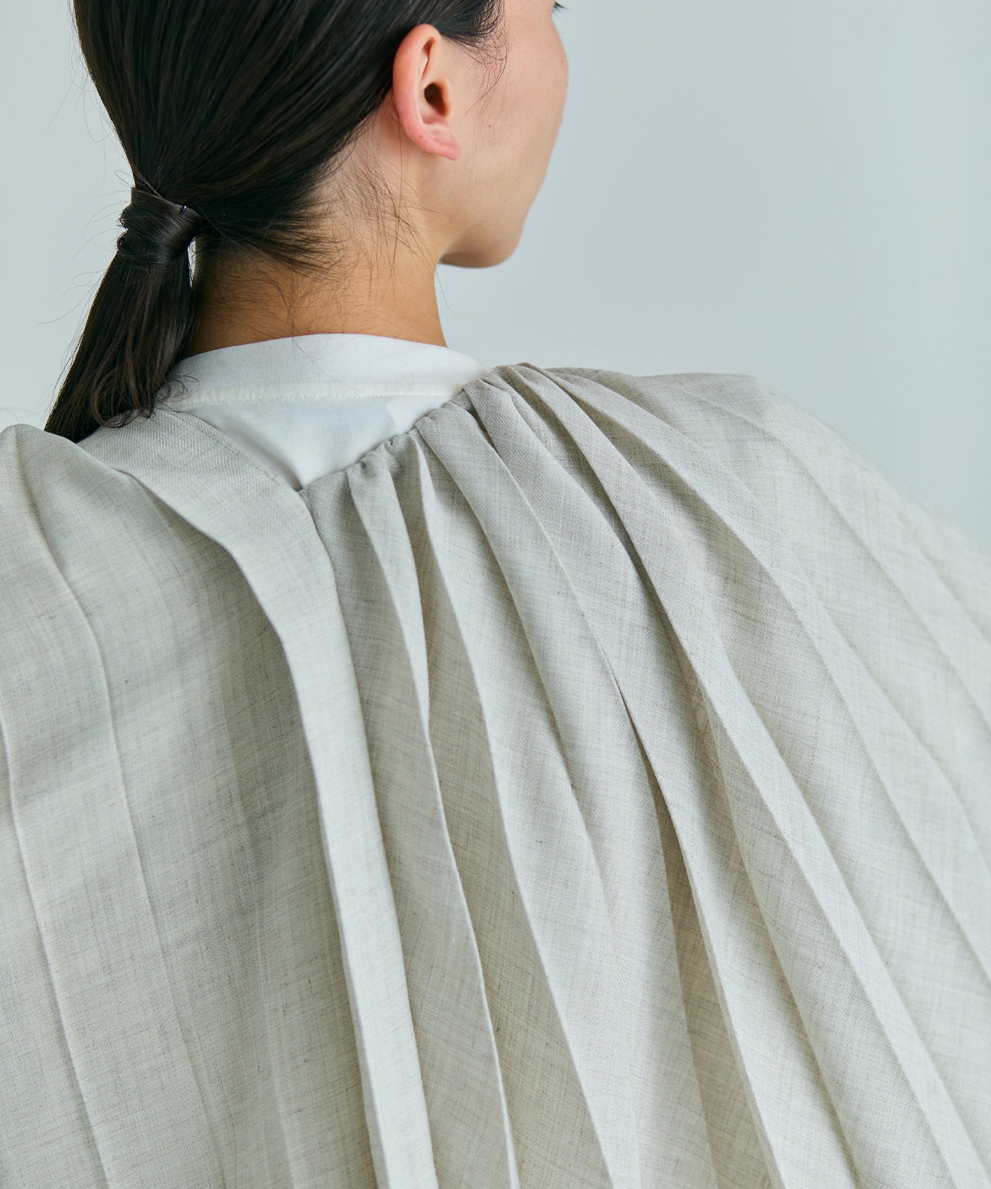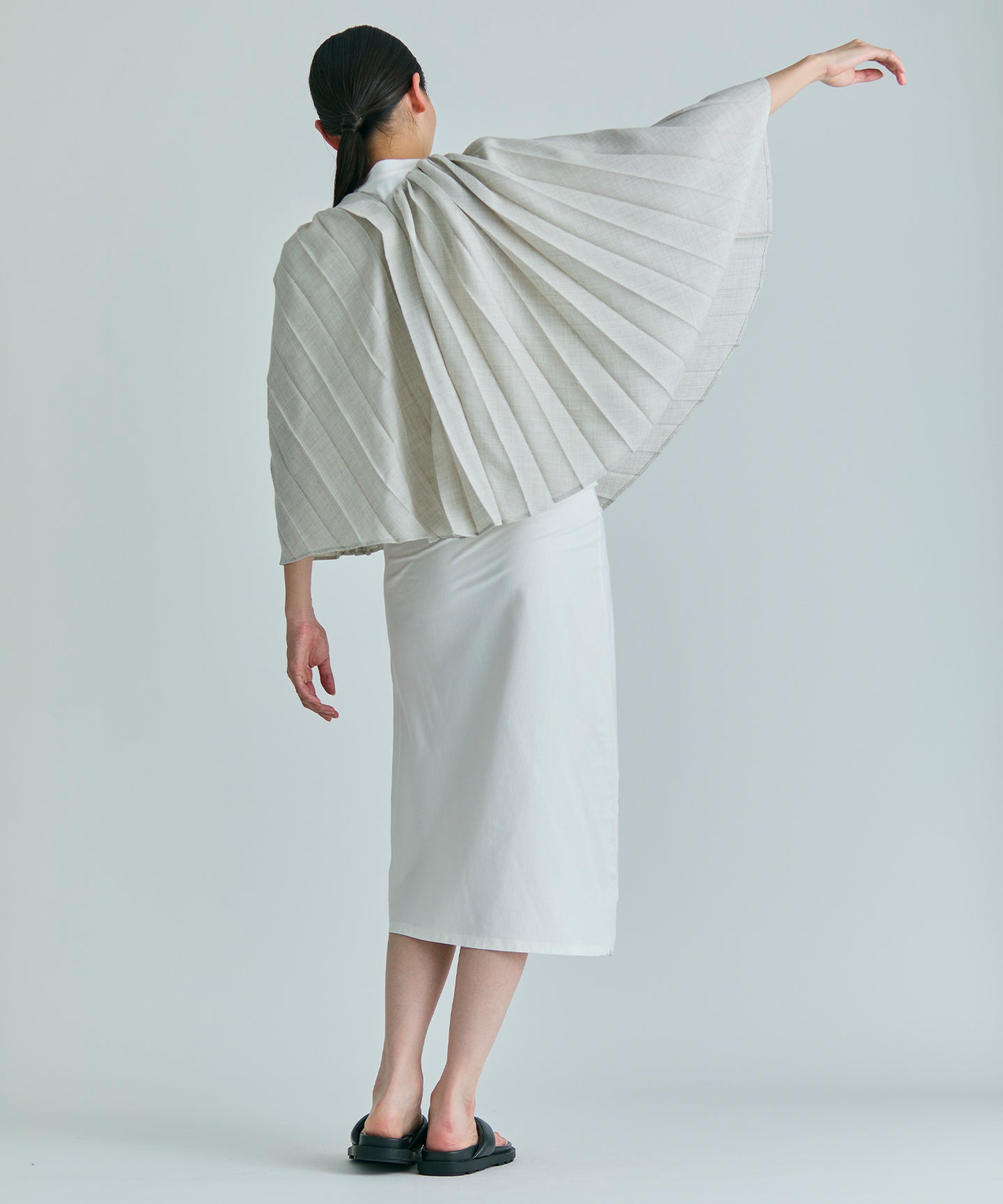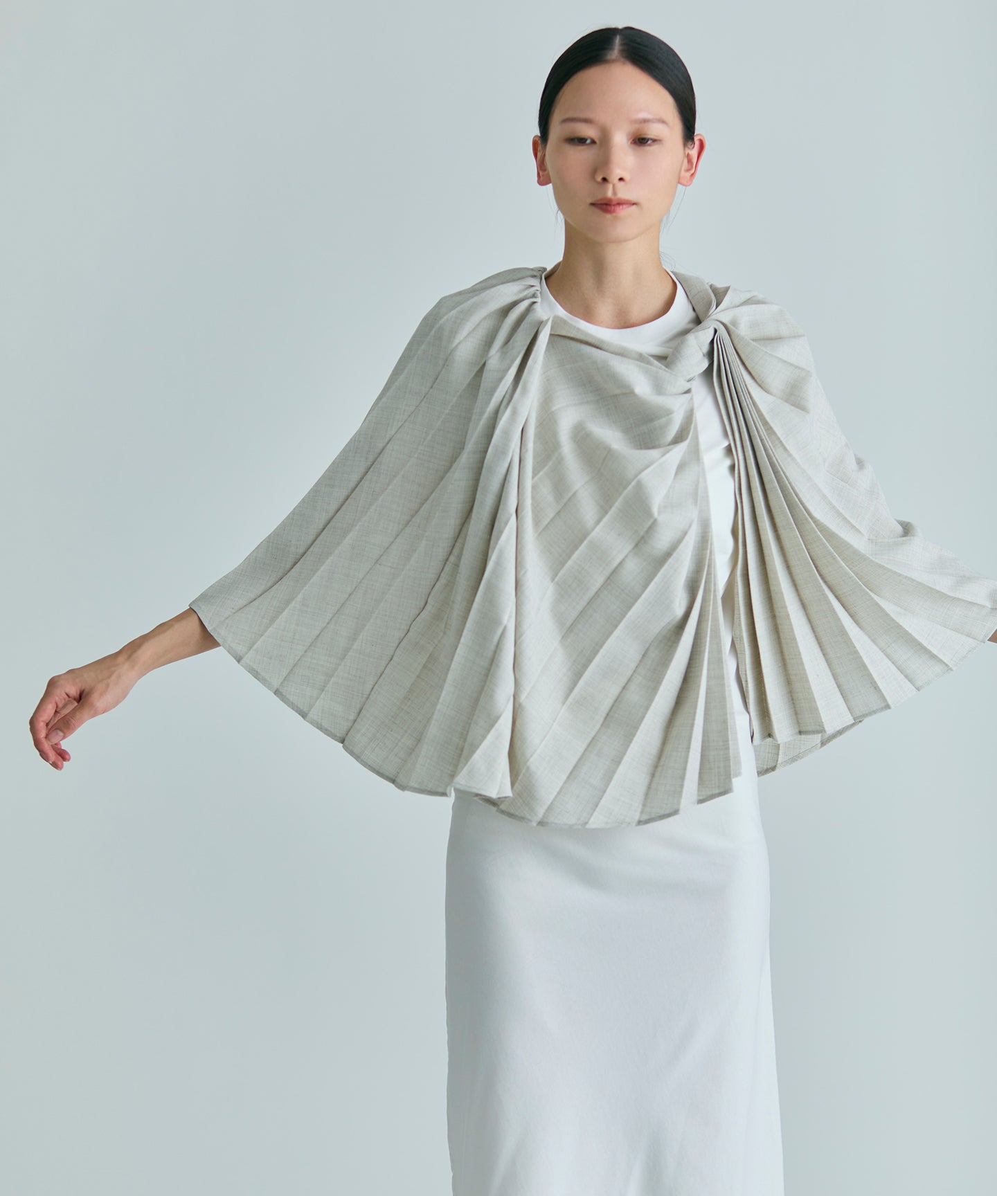 傘のイメージから生まれた、総プリーツのケープ。フロントに捻りのディテールを入れた、シンプルなコーディネートのトッピングアイテム。