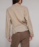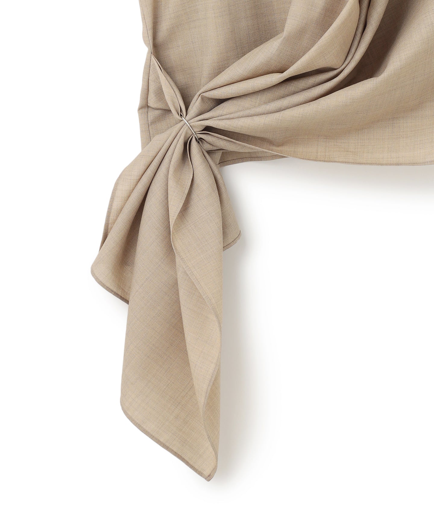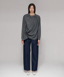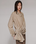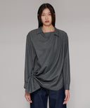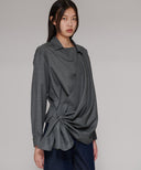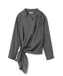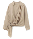 大きなストールで身体を包み込むようなイメージのリラックス感と、生地の上質な華やかさを大切にデザインしたシリーズ。左の身頃からしなやかなドレープが右の腰に流れ込む、カシュクールデザイン。ブラウスは、腰がふわっと隠れる丈のオーバーブラウス。ニットやワンピースと合わせたり、左身頃のドレープをリングに通さず無造作に羽織ったりと、着る方の似合うが必ず見つけられる1着。