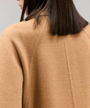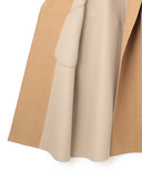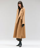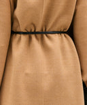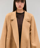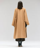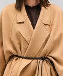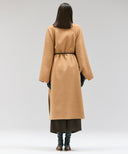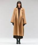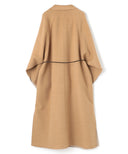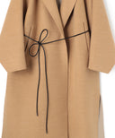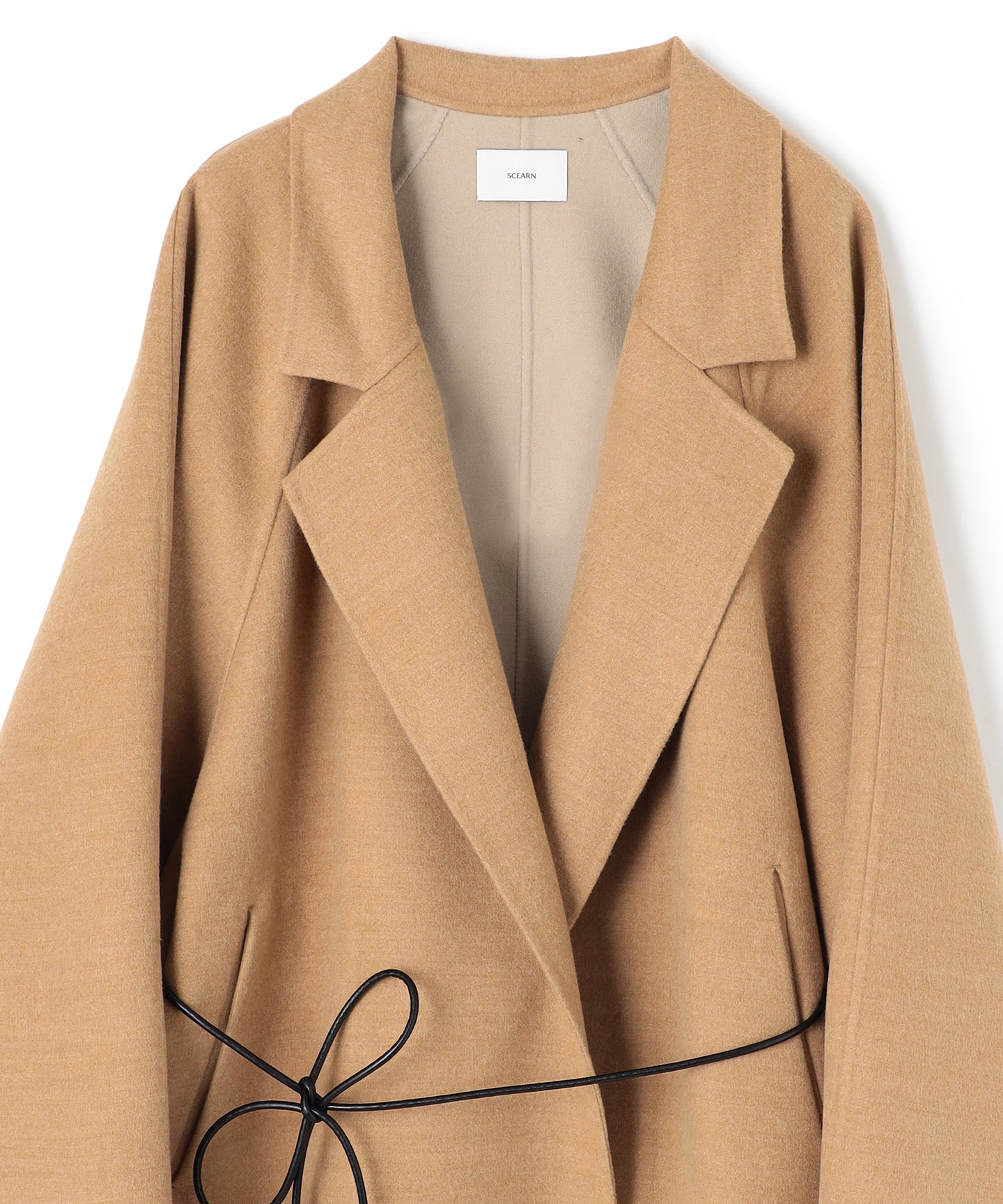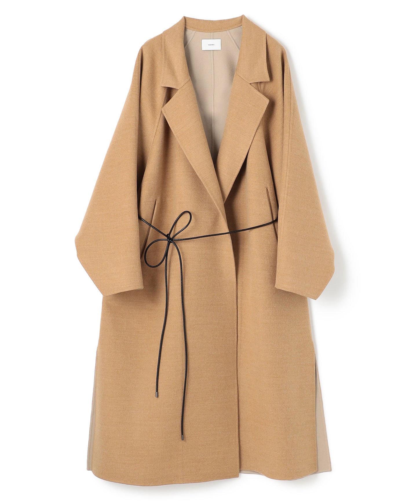 身体を包み込むようなゆったりとしたボリュームのチェスターコート。ふくらみとしなやかさのある上質なウール素材で体になじみ、職人が丁寧に仕立てたリバー仕立て。袖は丸みのあるボリュームのあるラグランスリーブでニュアンスのあるシルエットに。袖口にスリット。表と裏が濃淡の配色になっており、さりげない配色感を楽しめる。細めのしなやかなフェイクレザーの丸紐を片結びでウエストマークするのがおすすめ。
