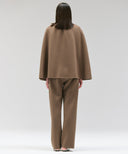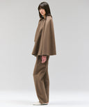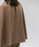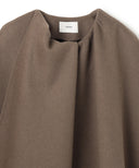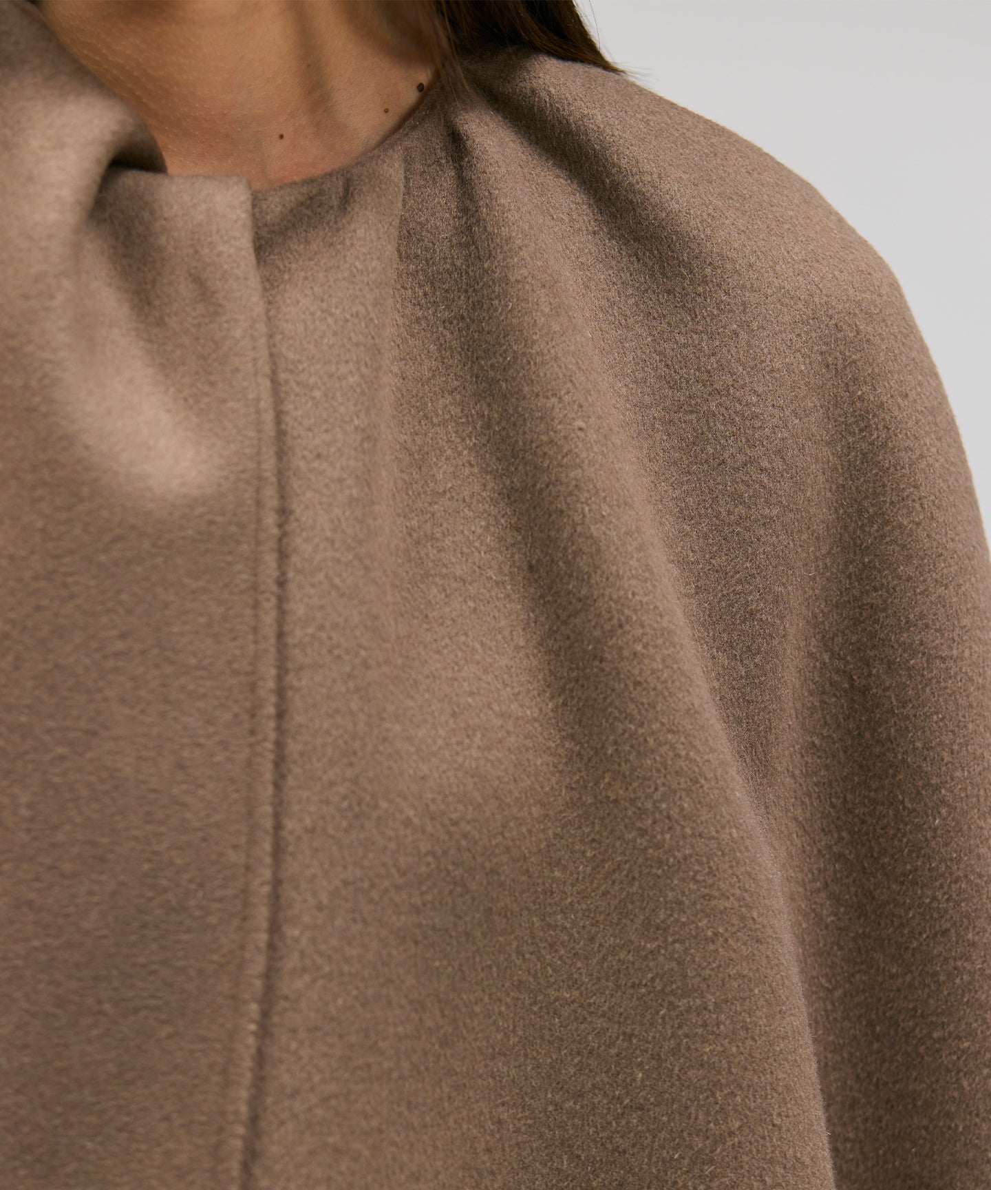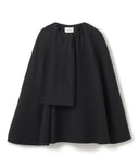 風呂敷包みからインスピレーションを受けた、ケープの様な体を包みこむショートコート。ストールを重ねた様なニュアンスのある襟元がポイント。上質な質感のウールのふくらみと肩からの曲線が上品な一着に。職人が丁寧に仕立てたリバー仕立て。