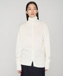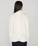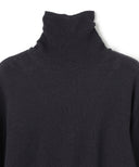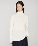 前後着用できる2WAY仕様のタートルネックニットトップス。天然素材が合わさり、柔らかさとシャリ感を程よく併せ持つ独特のタッチが、装いに奥行きをもたらします。折り返さないタートルネックは首元を優しく包み込み、柔らかさのある佇まいに。シルクのくるみ釦が控えめながらも洗練された印象を添える1枚。