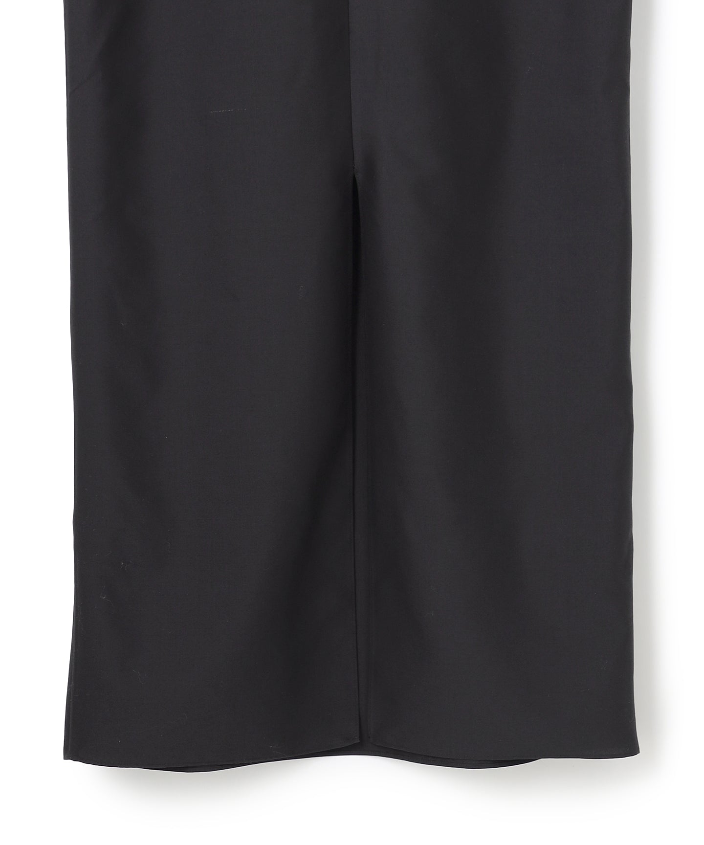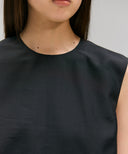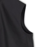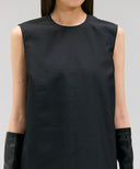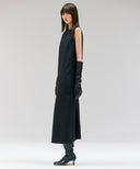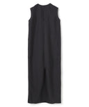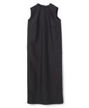 コンパクトな襟ぐりラインでミニマルなIラインのノースリーブドレス。上質なウールとシルクの光沢が上品なシンプルモードな一着。