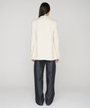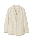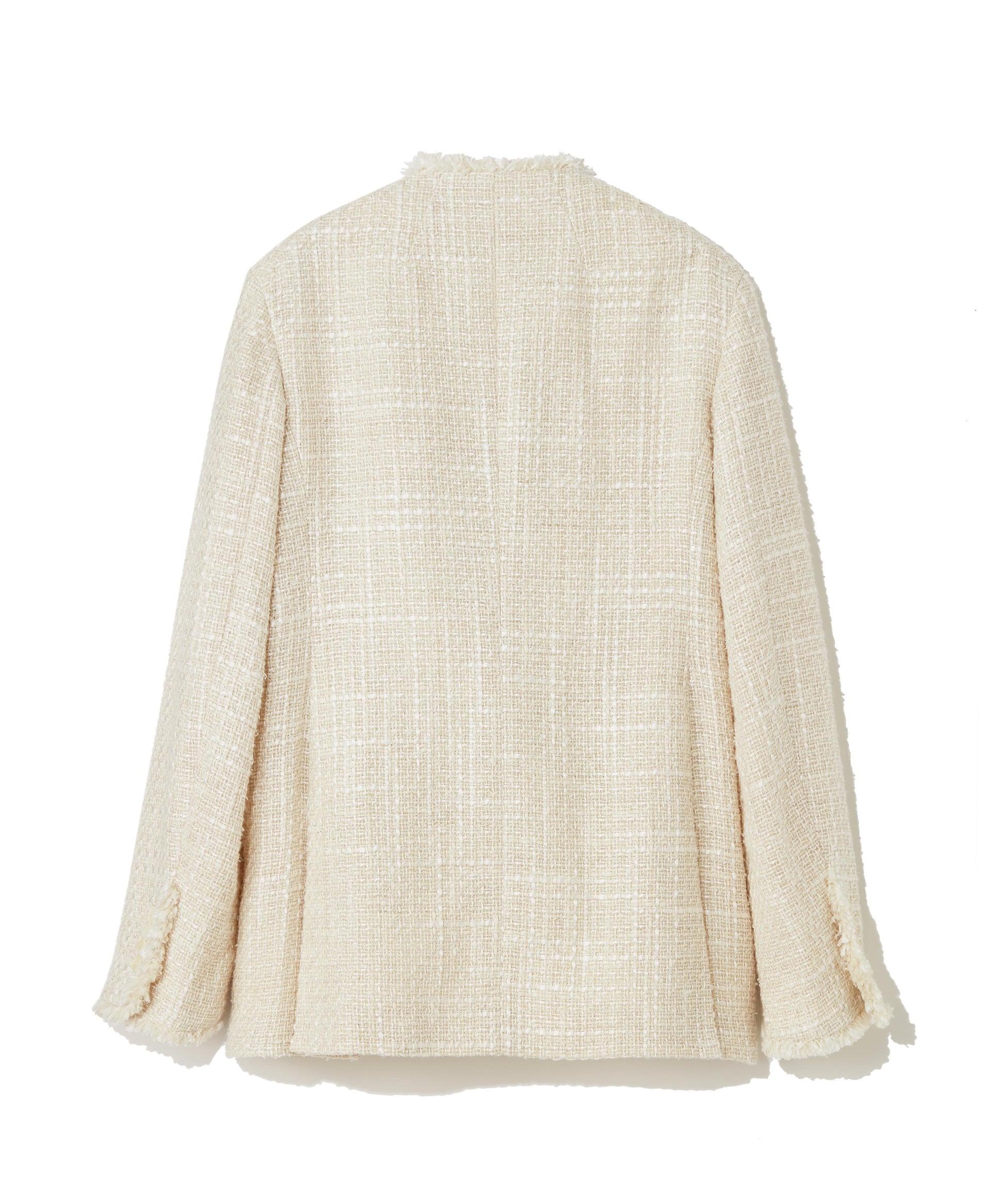 ほんのりと立ち上げたネックから肩先にかけ柔らかく包み込むようなラインに拘ったノーカラージャケット。ゆったりとしたシルエットながら後ろ姿は、華奢な美しく上品な1着。
