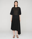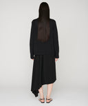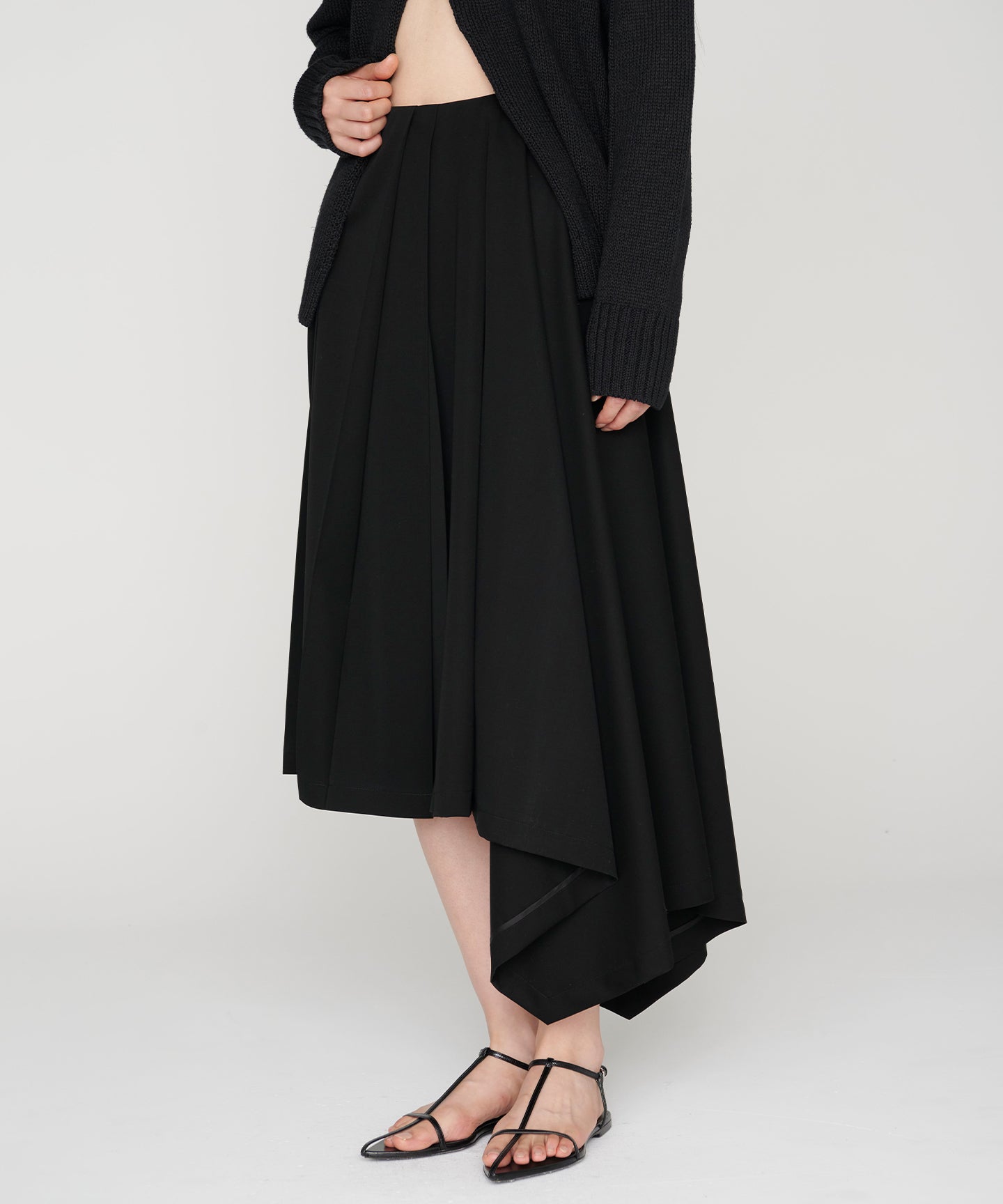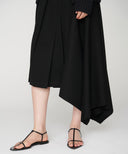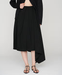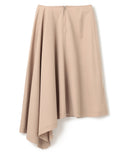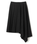 折り型をイメージしたスクエアのプリーツクロスを傾けて着用することで、プリーツからドレープしたフレアーへと変化させたアシンメトリースカート。コンセプチュアルな強さと優しい表現を兼ね備えた印象的なシーズンを代表する1着。